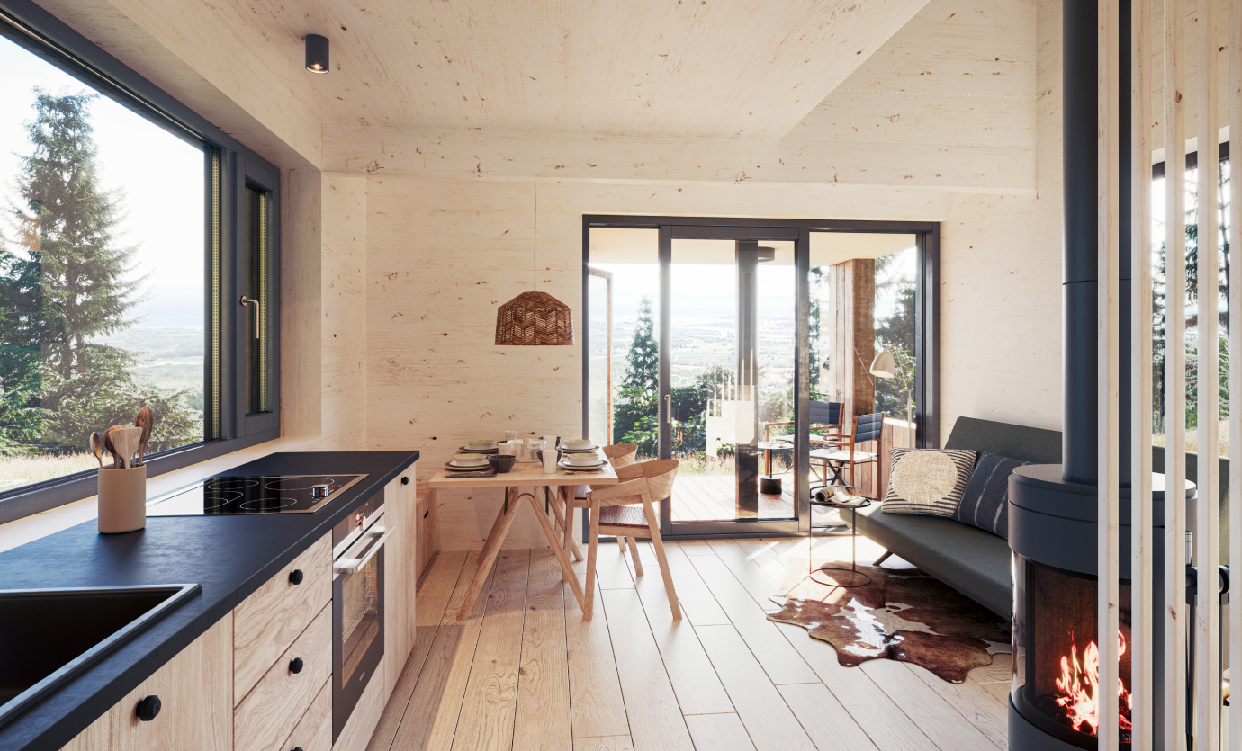 V přízemí se nachází obytný prostor s kuchyňskou linkou s velkorysým výhledem ven, jídelním stolem a posezením u krbových kamen. Dále je zde koupelna s vanou a toaletou. V horním patře jsou umístěné dvě ložnice a nad schody otevřená galerie, kterou lze využít jako menší pracovnu, nebo třeba pozorovatelnu hvězd, ke kterým máte blíže díky kruhovému střešnímu oknu.